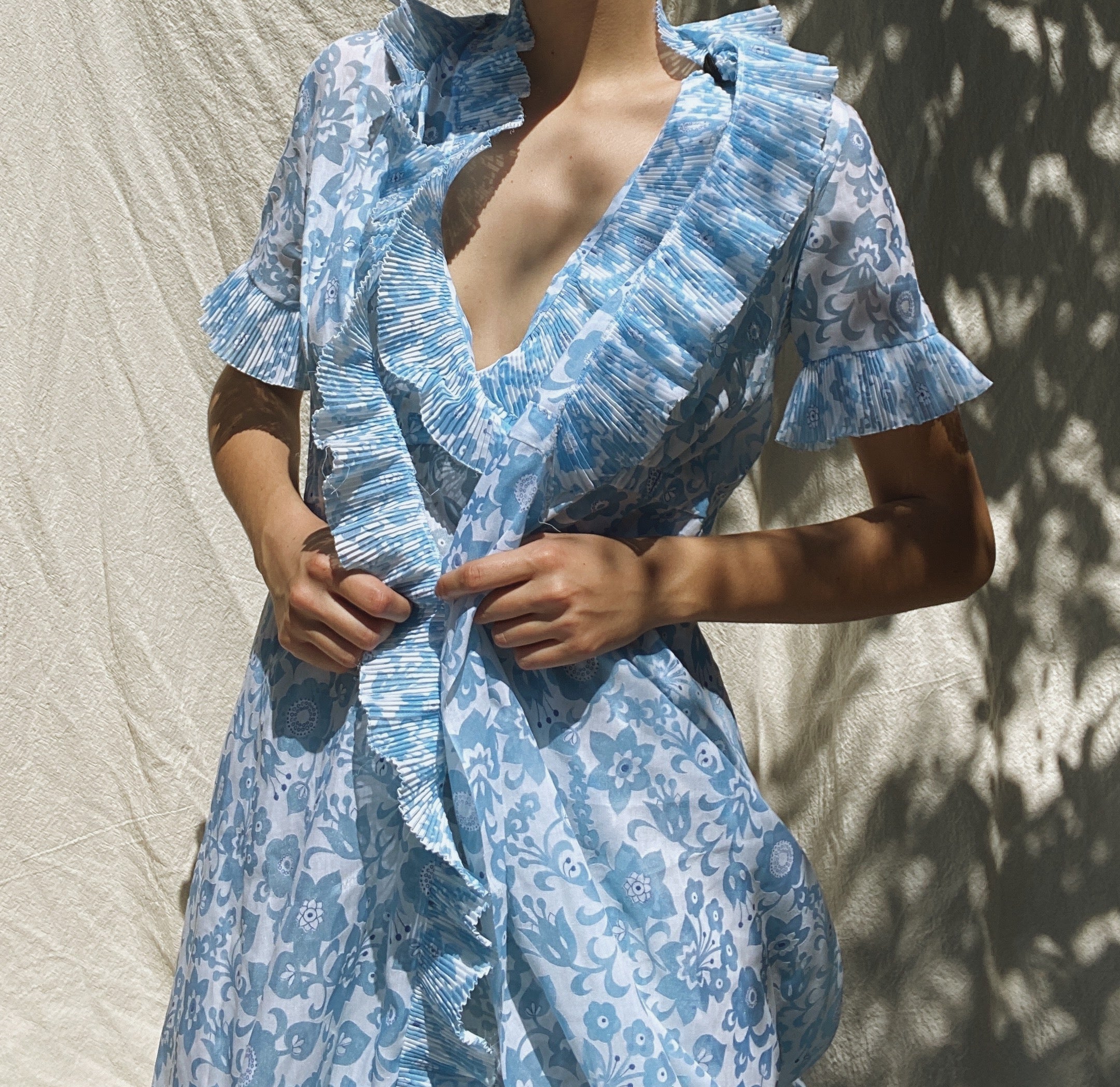 Romantic dress & robe set with sky blue and white flowers printed throughout a semi-sheer fabric. Ruffle details along the neckline of the dress, down the front and along the sleeves of the robe and on the hemline of both pieces.