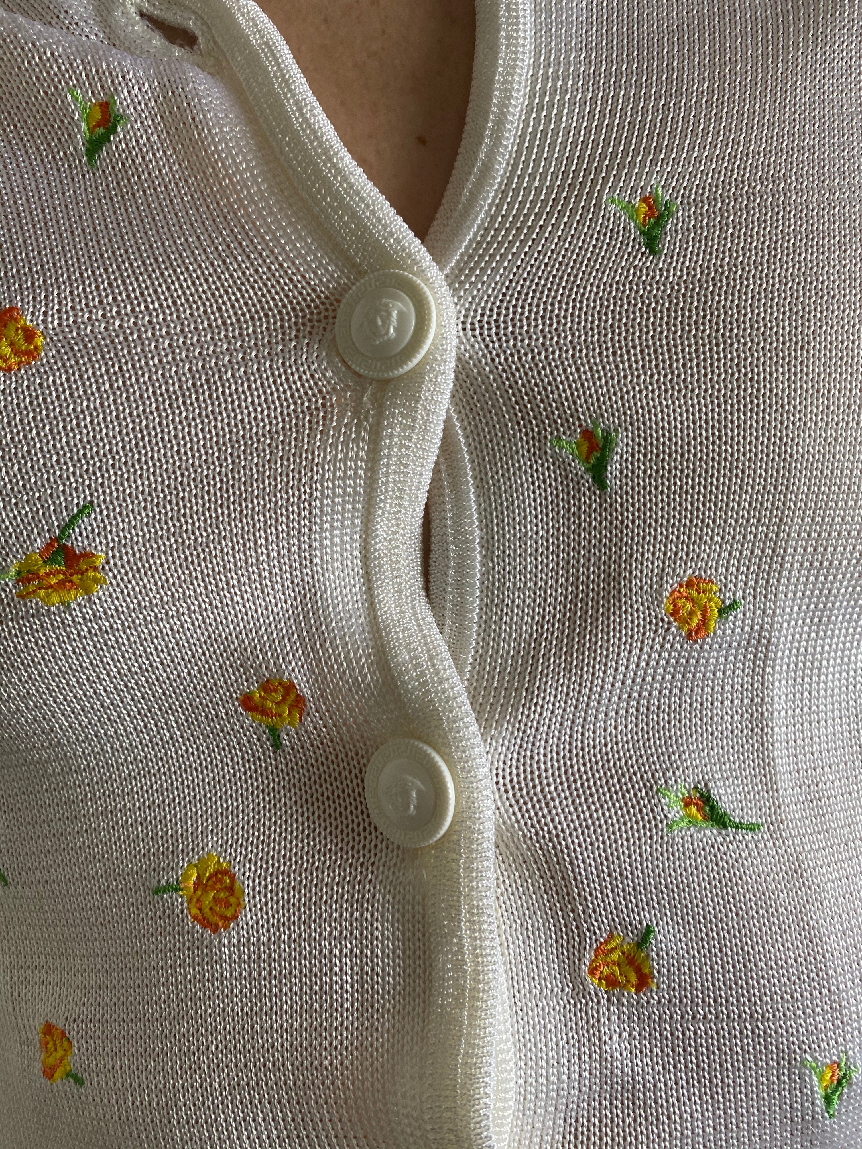 White knit cardigan with yellow, orange and green embroidered flowers. The buttons are embossed in the iconic Medusa logo.